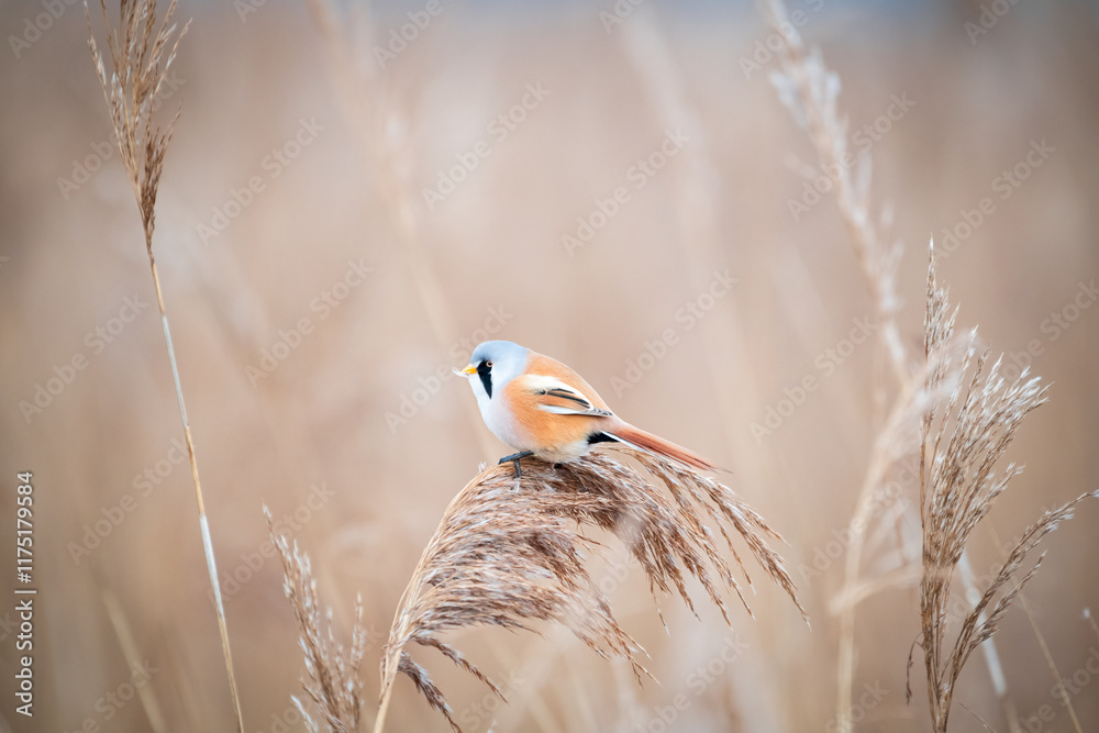 Bearded reedling (Panurus biarmicus), male, perched on a reed, Kallo, Belgium