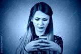 Upset unhappy woman holding cellphone. Sad looking girl texting on smartphone