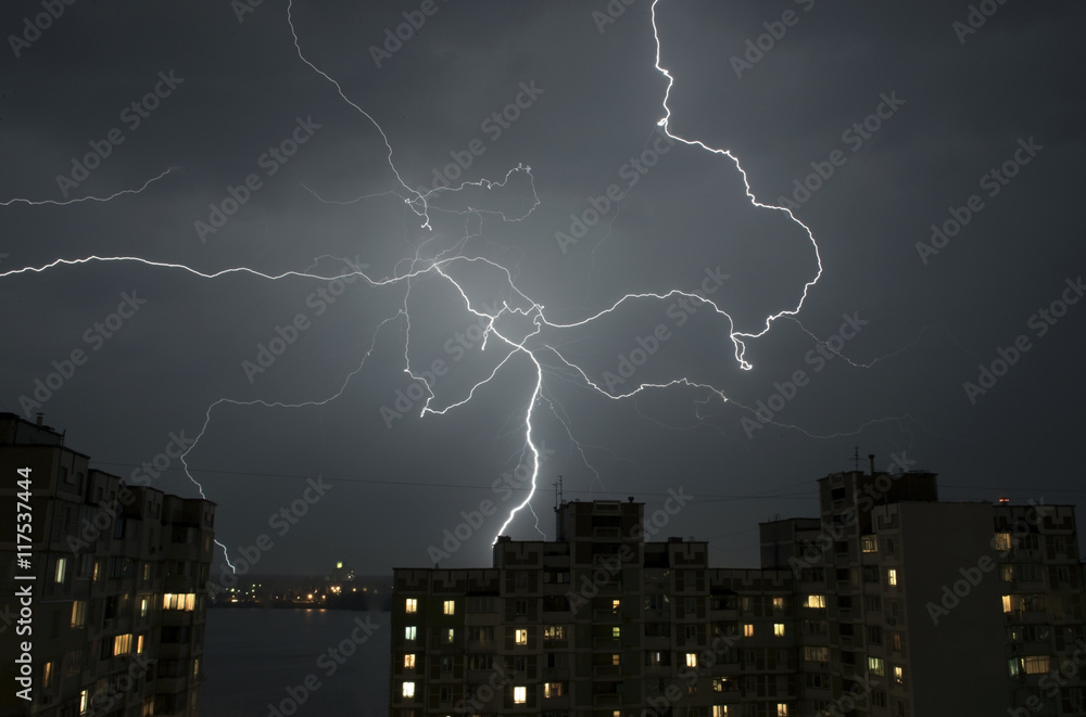 Lightning, thunderstorm. Lightning over houses. Lightning over town. Lightning over city
