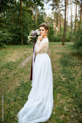 bride with a bouquet of color in the woods. wedding dress with long train.