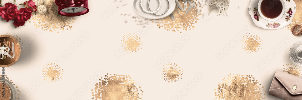 Romantic dressing table with feminine accessoires / golden dots backround - top view