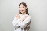 Smiling positive, hug self care happy asian young woman hands hugging herself shoulders, enjoy yourself, self love and self care, smile girl face expression self esteem standing isolated on background