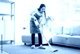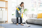 Vacuuming cleaning, asian young woman cleaning with portable cordless vacuum cleaner to clean floor on rug in living room at home. Housekeeping, housework and household chores and housework concept.