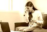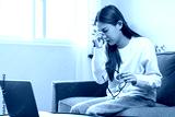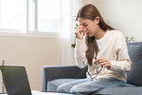 Eye problem concept, fatigue asian young woman tired eyes, irritated rubbing eye dry relief vision pain after work on laptop computer, eye strain, hand holding glasses, suffer migraine, bad blurry.