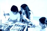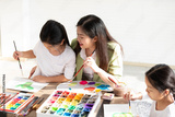 Children and Teacher drawing and filled with colorful paints in the classroom