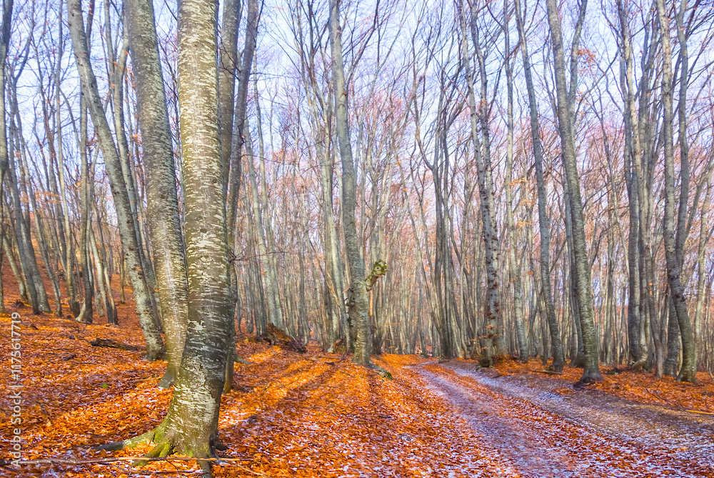 winter beech forest covered by red dry leaves