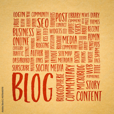 cloud of words or tags related to blogging and blog design - handwriting on art paper