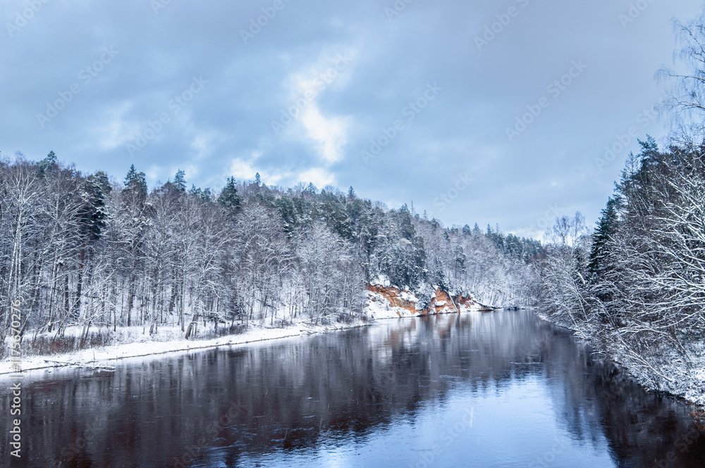 Landscape view of red sandstone caves on Gauja river in Sigulda, Latvia on winter day
