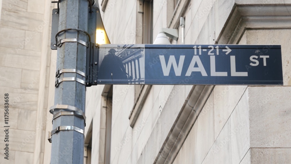 New York City United States. Lower Manhattan Downtown Financial District urban architecture. American Wall street road sign near Stock Exchange building, USA Stock Market.
