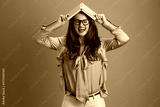 smiling trendy woman in green blouse and glasses against green
