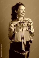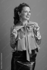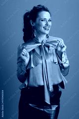 smiling fit woman in green blouse isolated on green background