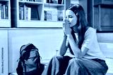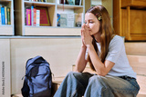Upset sad teenage girl high school student sitting on floor in library classroom