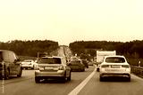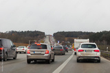 Back tail view of many cars stuck in row at highway road traffic jam cold overcast rainy winter day at Europe. Automobile accident vehicle rush hour collapse. Transportation vacation seasonal stuck