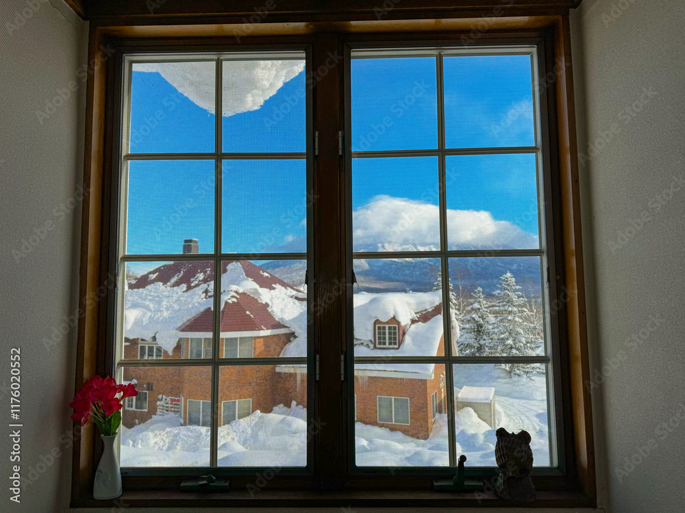 CLOSE UP: Picturesque window of a warm and cozy room frames a snowy landscape dotted with brick houses under a clear blue sky, with a spectacular view of distant Mt. Yotei and nearby frosted trees.