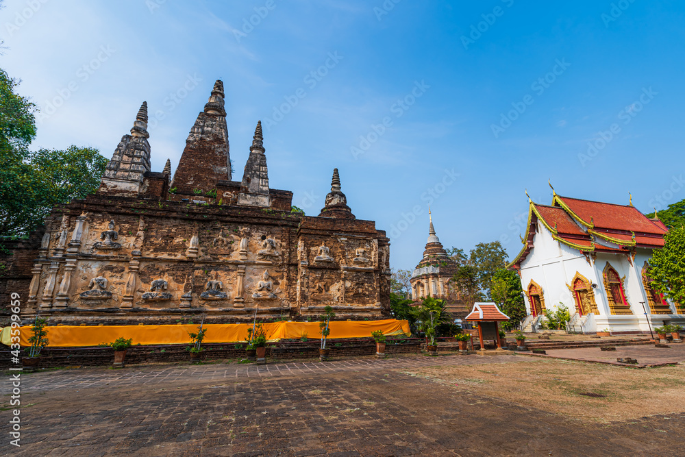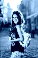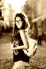 Outdoor portrait of young happy beautiful lady posing on the street of the old city. Girl smiling and looking at camera. Model wearing stylish summer clothes. Female fashion. Sunny day. Waist up