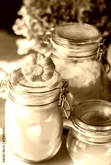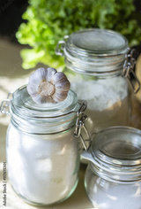 czosnek w kuchni położony na szklanym słoiku w otoczeniu różnej wielkości szklanych słoików z metalową sprzączką na tle zielonej sałaty