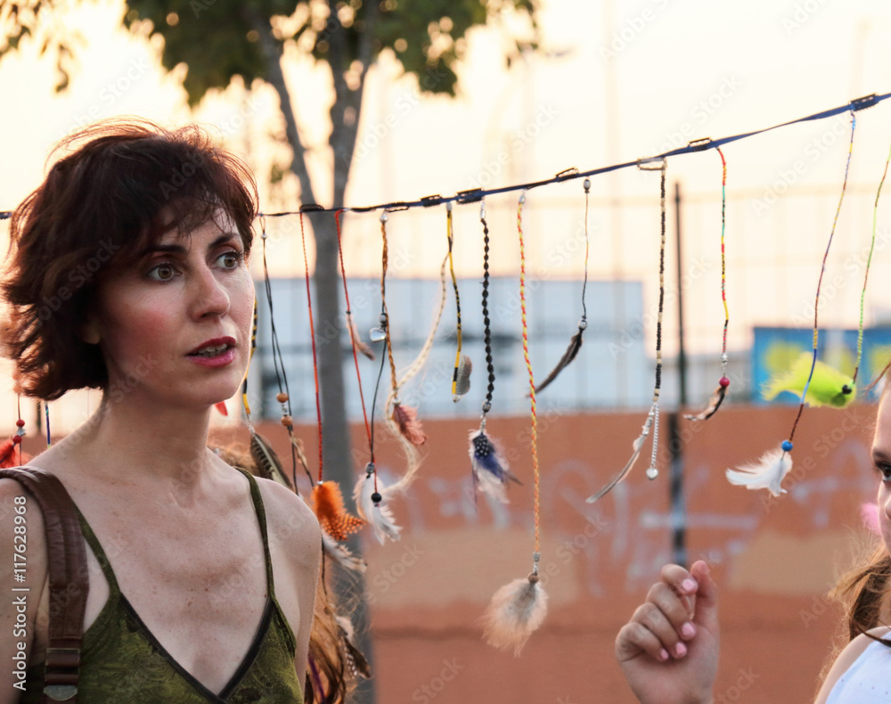 Close up of a brunette woman, young and pretty looking to infinity. Fund seen feathers hung
