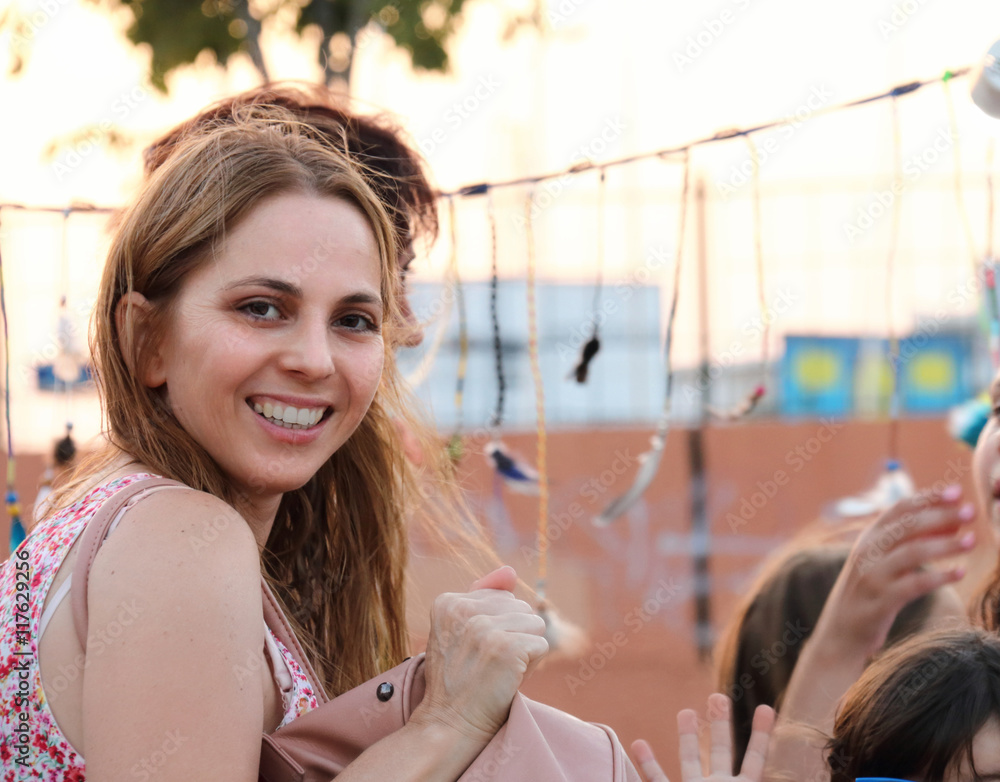 Close up of a brown-haired woman, young and beautiful, smiling at the camera, surrounded by several children
