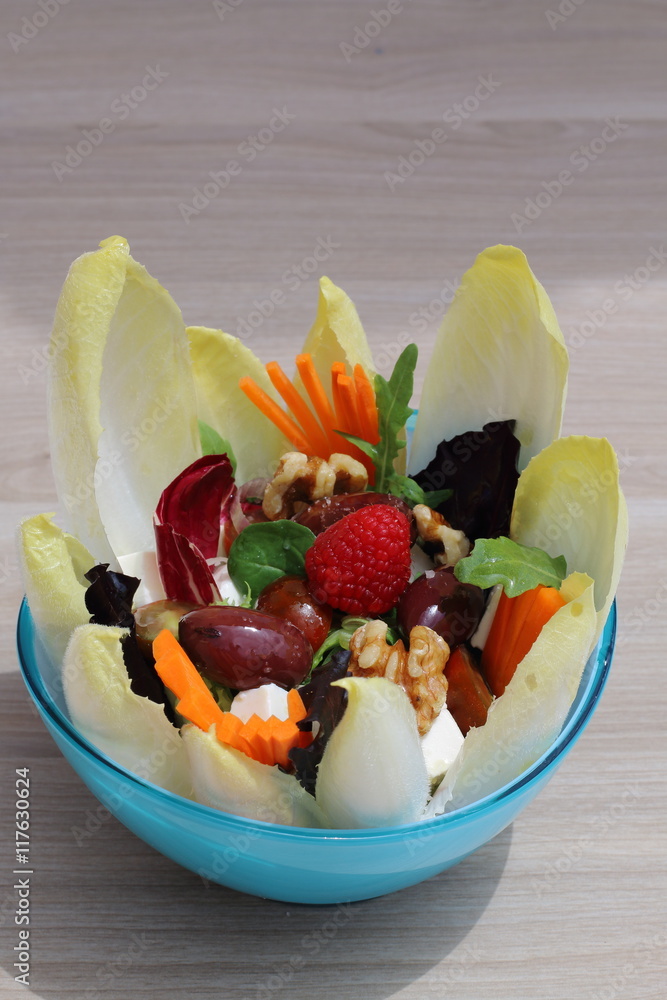 Individual serving of a delicious salad, fresh and nutritious, with many ingredients in a blue bowl on a light wooden table