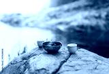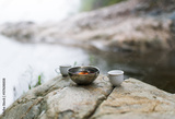 Cup of tea on the stone with campfire background.