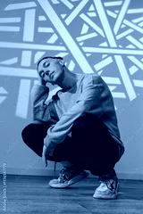 A young man sits with his legs crossed in a squat, with a projection of white lines and shapes behind him