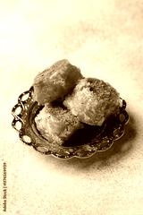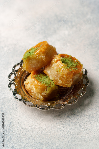 Delicious baklava topped with crushed pistachios served on an ornate dish