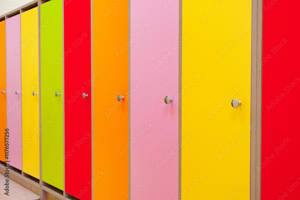 Colorful restroom stalls with a vibrant array of hues in a busy public space