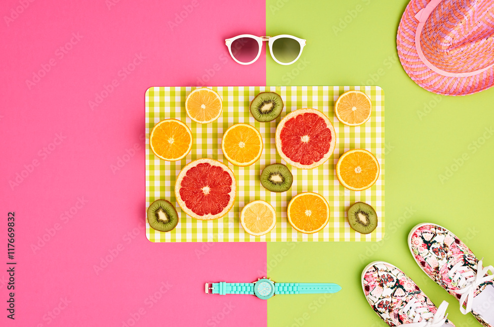 Fashion. Summer Clothes Accessories fashion set. Tropical Fruit Citrus, Orange, Lime. Fashion woman Glamor Wrist Watches, Trendy Sunglasses Gumshoes. Stylish girl Outfit. Fashion creative art concept