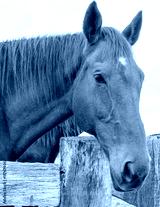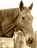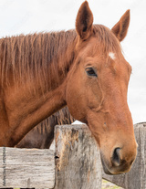 Portrait of chestnut horse against weathered timber fence against cloudy sky