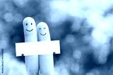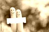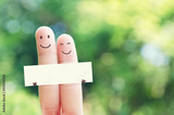 2 fingers holding blank paper while smiling face with nature bokeh background. Paper empty for message and wording.