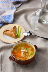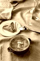 Rustic Fish Soup Composition with Light Earthy Tones and Soft Shadows