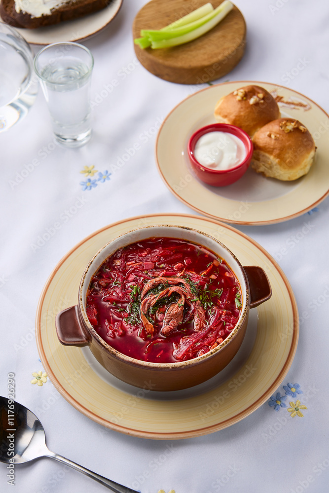 Traditional Beef Borscht in Natural Light with Elegant Composition