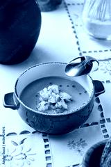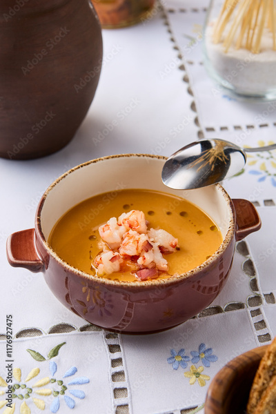 Gourmet Pumpkin Soup with Shrimp in Rustic Bowl - Vibrant and Artfully Composed Culinary Photography