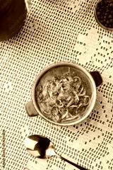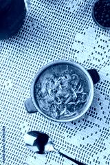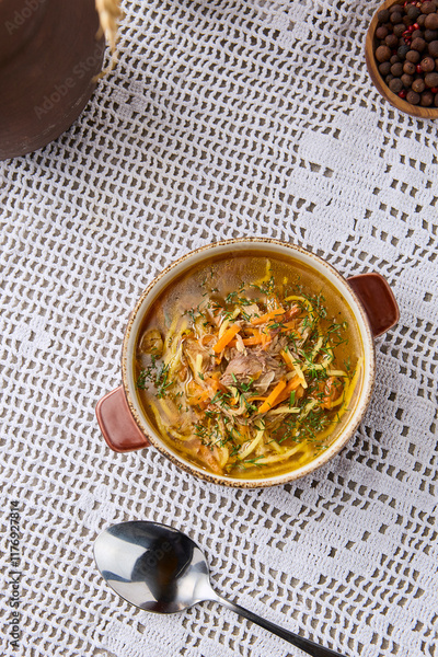 Rustic Fermented Cabbage Soup on Crochet Tablecloth Warm, Earthy Tones and Textured Elegance