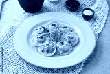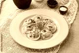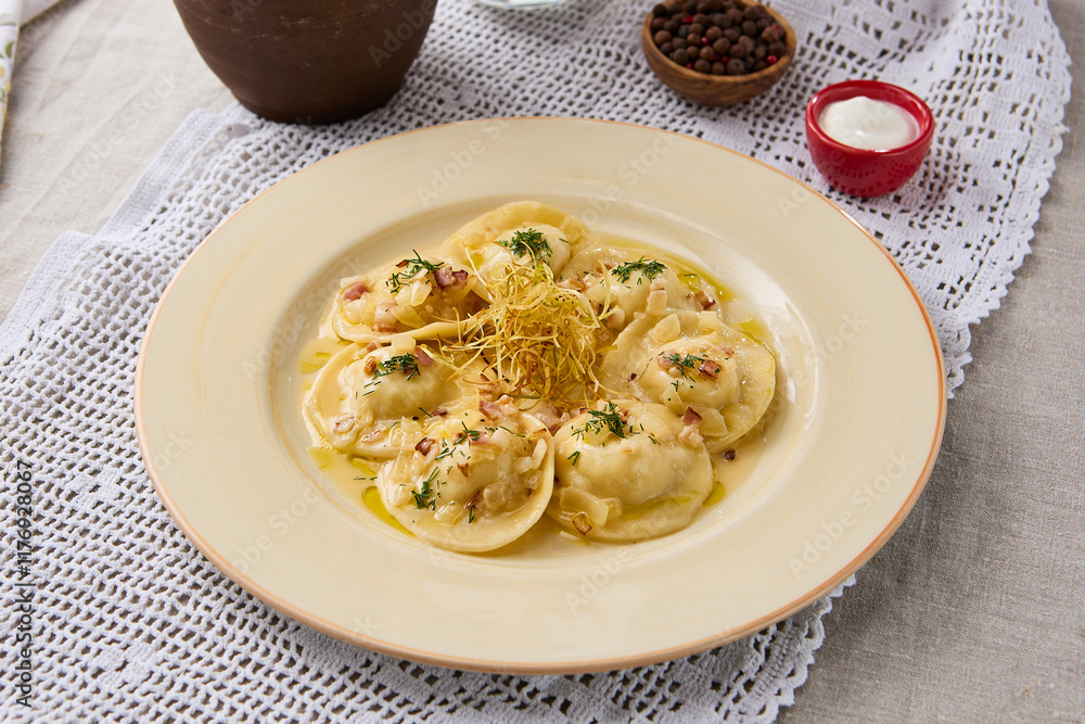 Gourmet Potato and Bacon Pierogi on Elegant Table Setting with Warm Lighting