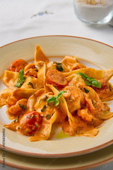 Creamy Tomato Shrimp Pasta in Soft Natural Lighting