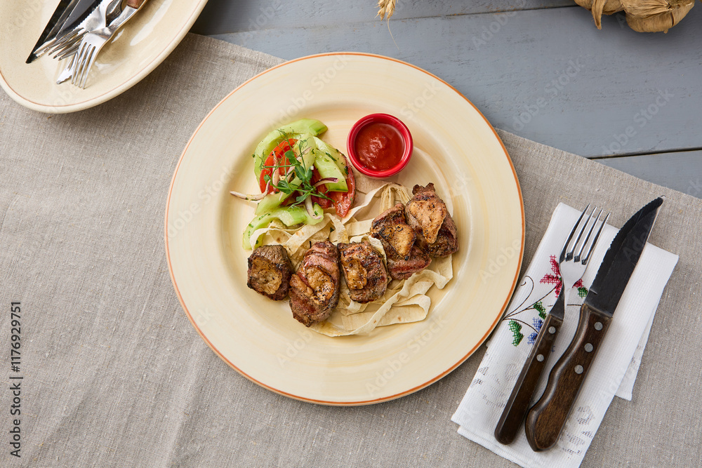 Lamb Shashlik with Kurdyuk Fat and Fresh Vegetables - Rustic Culinary Delight