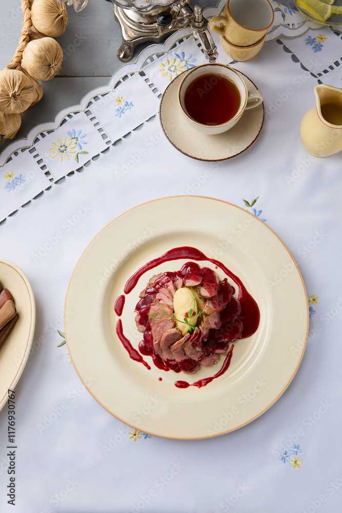 Gourmet Duck Fillet with Berry Sauce and Mashed Potatoes - Elegant Dining Photography