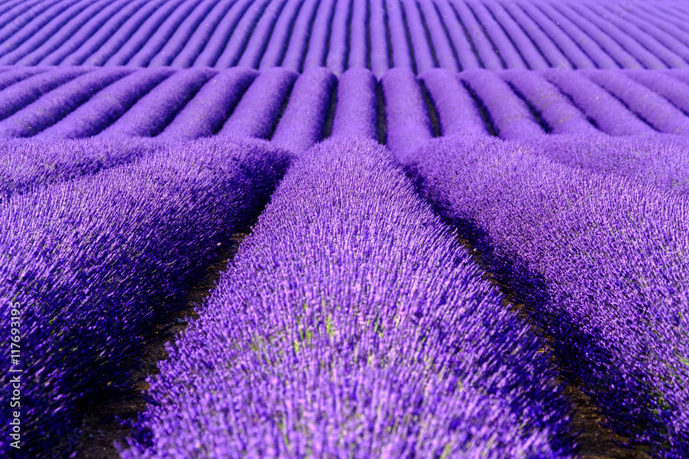 Lavender flower blooming scented fields in endless rows. Valensole plateau, provence, france, europe.