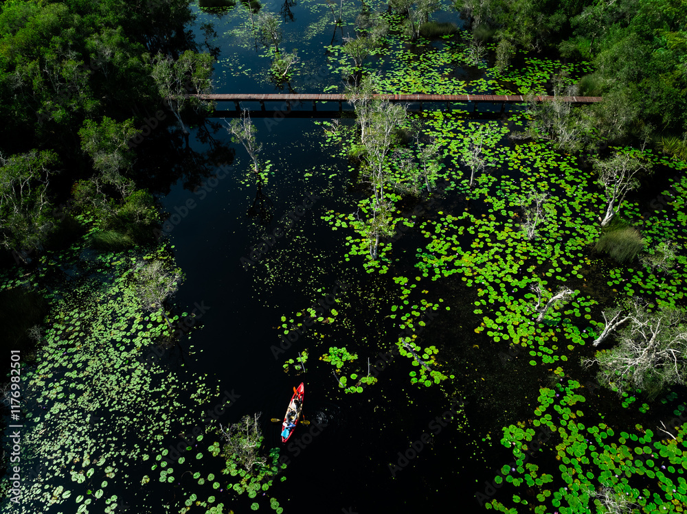tourist paddle kayaking at wetland nature and green lotus swamp at red bridge Rayong botanic garden,