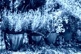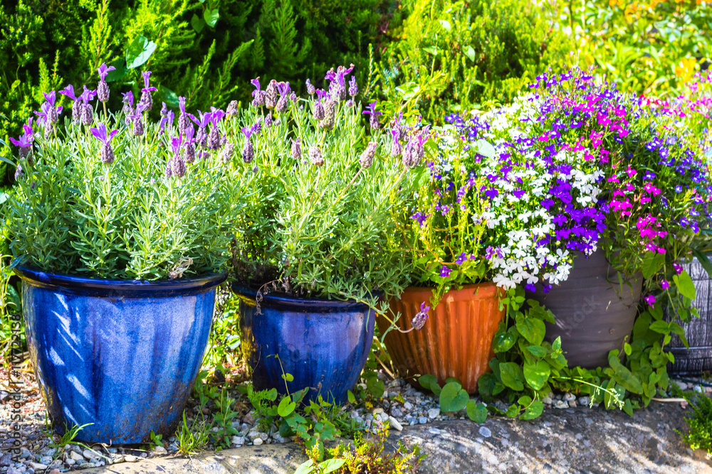 Beautiful colorful potted lavender plants and shrubs in the summer garden