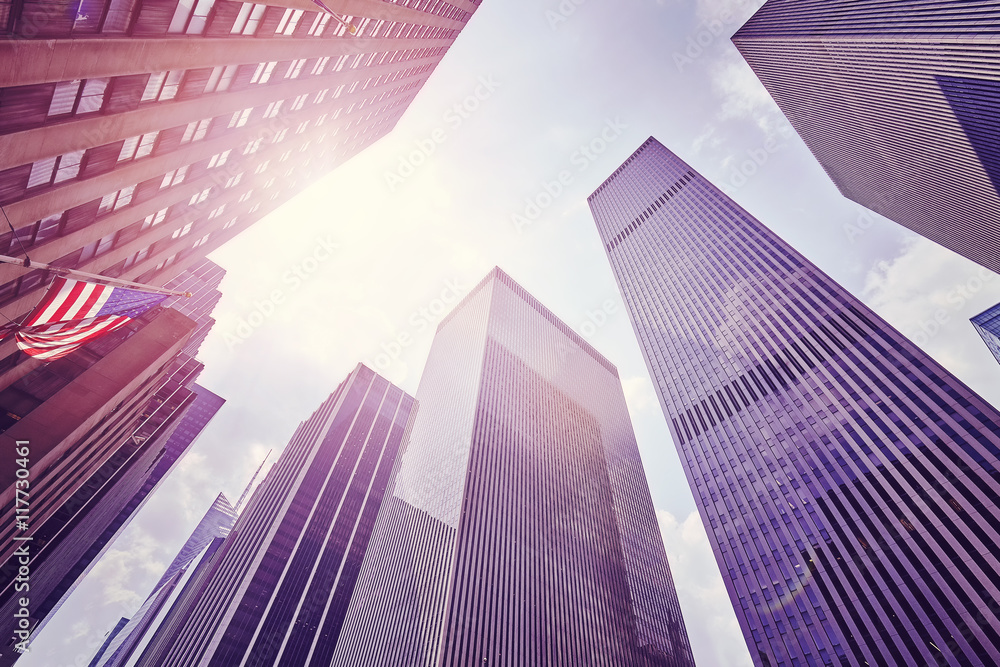 Vintage toned photo of skyscrapers in Manhattan at sunset with lens flare effect, New York City, USA.