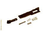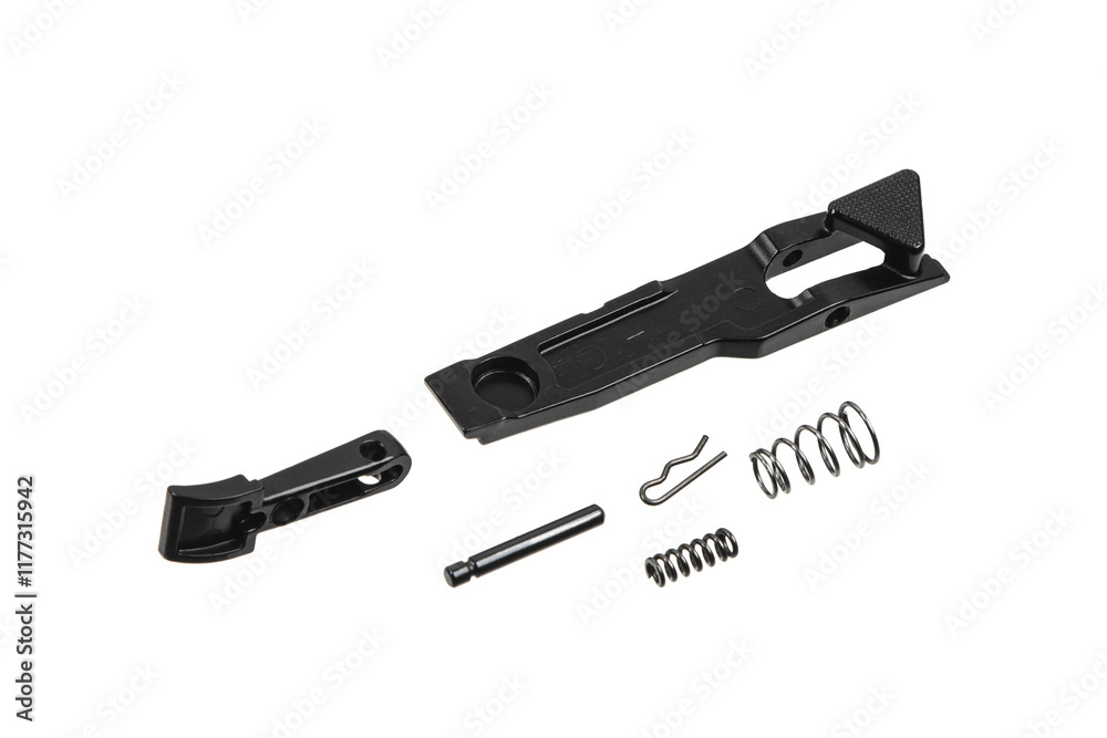 A disassembled firearm part kit, including a lever, pin, springs, and other small components, isolated on a white background
