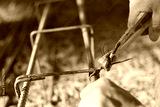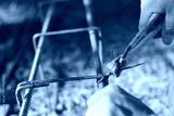 worker uses steel tying wire to fasten steel rods to reinforcement bars.