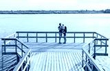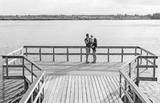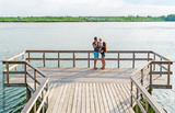 Happy young caucasian family with three year old daughter stand on a river pier.