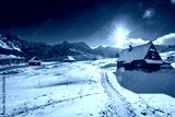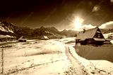 Small mountain cottage in winter valley at sunset, Poland