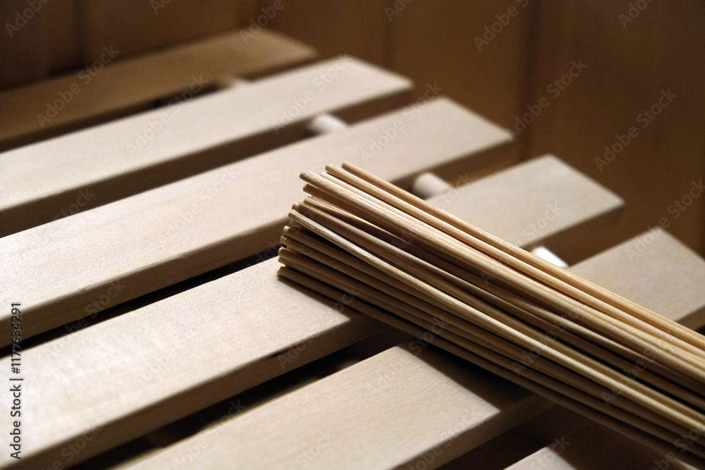 pillow and bamboo massage whisk in sauna