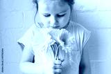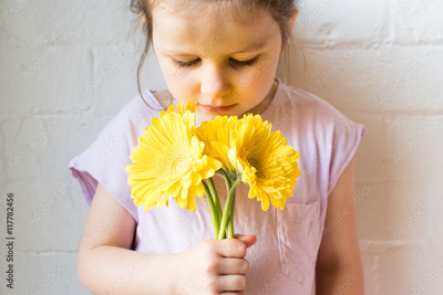 Little girl in lilac top looking down at yellow gerberas against rustic white brick wall (selective focus)
