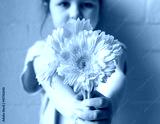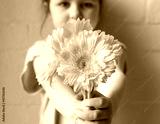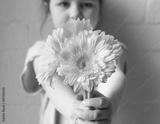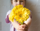 Little girl holding out yellow gerberas against rustic white brick wall (selective focus)