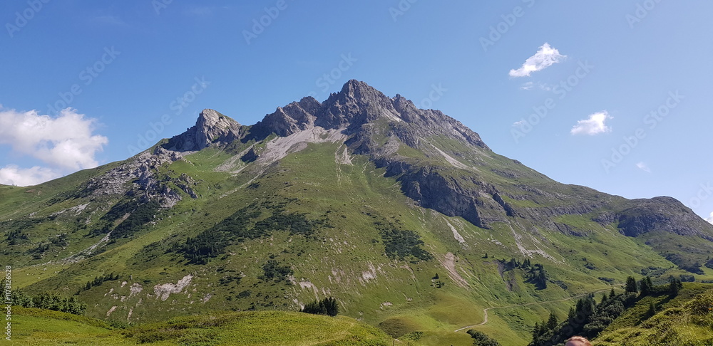 Green Mountain Slopes with Coniferous Forest and Blue Sky